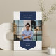 Personalize este anúncio de graduação moderno com uma foto horizontal ou orientada a paisagem, sobreposta em um banner de faixa de opções em azul clássico de marinho. Adicione seu nome de formando, escola e ano de graduação. Personalize as costas com uma foto adicional e uma mensagem pessoal.