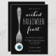 Um design de chico e divertido para uma festa. Este design apresenta uma imagem de um globo ocular num garfo prateado rico sobre um fundo preto. Três fontes contrastantes são usadas e você pode personalizar o texto para corresponder ao seu evento. Diz "Um banquete de Halloween malvado" que seria ideal para uma festa de janto temático no Halloween ou qualquer evento noturno para adultos ou crianças.