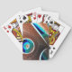 A arte digital abstrato nestas cartas de jogar sugere uma superfície brilhante 3D de cobre martelado com buracos perfurados até um plano azul de azure de existência... Ou algo assim. Deixe sua mente vagar...