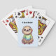 Jogando cartas com uma ilustração adorável com uma preguiça feliz vestindo uma camiseta verde. Sentado de pernas cruzadas, com aparência relaxada.