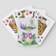 Jogando cartas com uma pequena fada com asas verdes sobre um cogumelo grande e visto, acompanhado por uma borboleta roxa. Abaixo, flores roxas vibrantes e folhas verdes exuberantes adicionam cor à cena química.