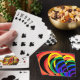 Este baralho de cartas de jogar, corajoso e colorido, exibe um padrão tridimensional abstrato de luas da crescente do arco-íris em cores vermelha, laranja, amarela, verde, azul e roxa em um fundo preto.
