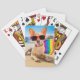 Esta foto fofa mostra um cachorro chihuahua na praia carregando uma bandeira Orgulho gay de cor arco-íris.