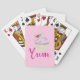 Cartões de jogar desenhados com a ilustração de um cupcake alegre com espirais cor-de-rosa e uma baga com folhas aninhadas no glacé. "Yum" escrito em rosa quente com fonte de tendência de rico. Definido em um fundo rosa suave.