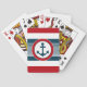 Design náutico com decoração em forma redonda com âncora sobre fundo listrado a azul, vermelho e branco