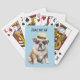 Um Bulldog castanho e branco veste óculos escuros vermelhos e um chapéu de palha na frente dessas cartas de jogar. O texto no topo diz "Deal Me In". A imagem e o texto são colocados sobre um fundo azul claro.