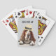 Um Cachorro de Caça-Basset castanho e branco veste um chapéu de palha na frente dessas cartas de jogar. O texto no topo diz "Deal Me In". A imagem e o texto são colocados em um plano de fundo de cinza pálido.