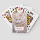 Jogando cartas com uma bela ilustração. Um gato branco de cabelos compridos que parece real e elegante. Cercado por flores cor-de-rosa, joias de ouro e diamante.