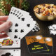 Uma cena assustadora de um quintal assombrado com uma coruja empoleirada em uma árvore assustadora que também tem o nariz de um enforcador pendurado nela. O fundo é um céu laranja e há uma lua de cheio com morcegos voando sobre ele. Muito divertido e assustador design para o seu Halloween jogar cartas.
