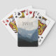 Jogando cartas com uma fotografia de belas montanhas, céu nublado e colinas rolantes cheias de árvores em primeiro plano. esquema de cor azul da cinza.