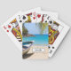 Cartões personalizados com uma cena de praia tropical idílica. Água clara de cristal azul turquesa e uma praia arenosa castanha macia. Algumas folhas de palma penduradas de cima. Um velho barco a remo de madeira fica sentado na praia. Uma paisagem serena e pacífica.