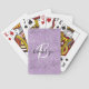 Estas elegantes cartas de jogar personalizadas apresentam um monograma e primeiro nome em modernos roteiros preto e branco sobre um padrão de popa-leopardo falso-prateado em um fundo roxo.