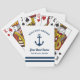 O conjunto de cartas de jogar personalizado náutico "Bem-vindo a Bordo" apresenta uma âncora de barco estilo costeiro com design de tipografia na moda e faixas horizontais. Personalize o texto com o nome e a localização do barco. Faz um presente único e divertido para os proprietários de barcos. O esquema de cores azul e branca do marinho clássico pode ser modificado.