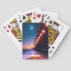O baralho personalizado para amantes de praia apresenta um píer com postes iluminados e uma lua de cheio brilhando ao anoitecer. Design criado com o uso do software AI.