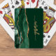 Personalize this elegant modern design with your name in vertical gold-colored signature handwriting script on an emerald green background with a border of emerald green watercolor agate trimmed with gold faux glitter. (To keep the swashes at the beginning and end of the name, replace only the letters, leaving the symbols in place.)