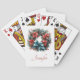 Jogando cartas com uma bonito coroa de Natal. Uma imagem festiva com um pínus corado com flores vermelhas, holly e um adorável arco azul. Que encantador.
