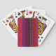 Este baralho de cartas de jogar apresenta um padrão colorido de abstrato que se assemelha a bandas ou faixas horizontais tecidas. As cores brilhantes do vermelho, roxo, azul e preto parecem brilhar. A imagem é tão realista que quase parece um pano real.
