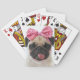 Pug dog com a língua para fora com uma fita cor-de-rosa, fundo branco.