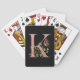 Rico rosa-brilhante letra K com folhas de ouro e espirais e uma borboleta de cobre sobre fundo de cinza.