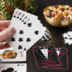 Diversão jogando cartas com um smoking de gravata preta e corsagem de flores de rosa vermelha para personalizar com o nome do noivo um jogo de pôquer de solteiro. As cartas personalizadas também fazem um presente divertido para os contínuos de casamento.