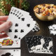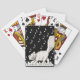 Este baralho de cartas é preto coberto de notas musicais brancas com um feliz gato branco sorridente caminhando através das teclas do piano enquanto pisca.