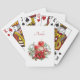Jogando cartas com um buquê bonito feito com aquarelas. Velas vermelhas com sotaques dourados e uma vela branca menor também. Cercado por um buquê de pinho com uma flor de poinsettia.