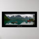 Poster de uma paisagem com dois velhos barcos a remos num lago com reflexo das montanhas no calcanhar do Hotel Hjelle, Hjelle, Stryn, Sogn og Fjordane, Noruega sobre fundo negro com o texto: "Silêncio". É uma foto panorâmica, perfeita para decorar sua parede.