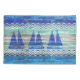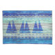 O oceano náutico temia o decor litorâneo de três marinhos de veleiros azuis em madeira velha e intacta. designs náuticos para costeiro ou praia. Perfeito para uma cabana ou uma casa de praia. No centro de um gráfico azul naval de ondas oceânicas.