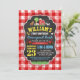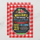 Cultive o convite do primeiro aniversario com xadrez vermelha, tratores vermelhos, um celeiro e uns animais de fazenda bonitos, um cavalo, porco, vaca, galinha e pato.