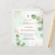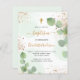 Um fundo verde branco e claro, decorado com eucalipto verde e pó dourado falso. Personalize e o nome e os detalhes da cerimônia. Letras pretas e ouros coloridas. Sexo neutro. Fundo: fundo verde claro,