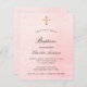 Um batismo moderno e elegante, celebrando uma menina. Um fundo cor-de-rosa pincelado decorado com pequenos brilhos de ouro, pontos e uma cruz de ouro. Personalize e adicione um nome e detalhes da parte. Letras pretas coloridas. Script elegante
