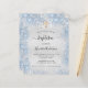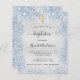 Um batismo moderno e elegante, celebrando um menino. Fundo metálico de aspecto fino prateado, decorado com poeira brilhante azul e uma cruz de ouro. Personalize e adicione um nome e detalhes da parte. Letras pretas coloridas.