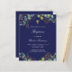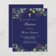 Um fundo azul marinho decorado com verde de eucalipto e folhas de ouro. Personalize e o nome e a cerimônia da criança. Voltar: fundo azul marinho