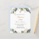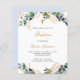Um fundo branco decorado com verde de eucalipto e folhas de ouro. Personalize e o nome e a cerimônia da criança. Letras pretas e ouros coloridas. Fundo: fundo azul claro