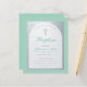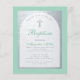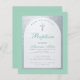 Um convite para o batismo moderno. Em um fundo retangular verde da casa da moeda, ele tem um arco falso de folha de alumínio prateado que tem texto de cinza sobre fundo branco. Apenas a palavra Baptism e o nome são escritos num guião caligráfico verde elegante; a primeira linha é o texto arquivado.