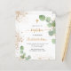 Um fundo branco decorado com verde de eucalipto e pó de ouro falso. Personalize e o nome e os detalhes da cerimônia. Letras pretas e ouros coloridas. Sexo neutro. Traseira: fundo branco com poeira brilhante ouro.