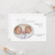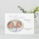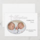 O fundo branco tem a palavra "Batismo" e é embelezado por uma cruz prateada intrincada. A janela de foto oval também é emoldurada em prata. Coordena-se perfeitamente com o nosso Convite Foto Prata de Batismo com Palavra.
