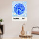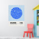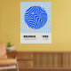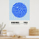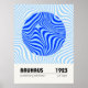 Minimalist Bauhaus-style poster featuring geometric blue circular patterns, advertising the 1923 exhibition held from July to September.