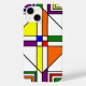 Esta capa de telefone tem um design Bauhaus de linhas, triângulos, diamantes e quadrados fazer um olhar colorido em cores primárias e secundárias.