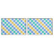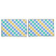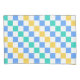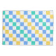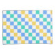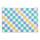 A colorful checkered pattern with alternating blue, green, and yellow squares on a white background. The design is vibrant and geometric, creating a playful tone.