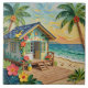A pretty impasto beach themed tile with a cute beach house, palm trees and tropical flowers.