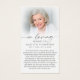 Keep the memory of a loved one close with this personalized prayer card with the poem "Footprints In The Sand" and a photo of footprints along a beach shoreline at sunset on one side and a cherished photo of them on the other side along with the sentiment IN LOVING MEMORY OF NAME and dates and editable text you can change to a heartfelt message, remembrance tribute, prayer or bible verse. With its simple yet elegant classic design and modern script typography, it makes a meaningful keepsake to share at a funeral, memorial service or Celebration of Life or send with thank notes and offers comfort and a lasting tribute for family and friends. Its small and portable size of 3.5x2" (wallet-sized) makes it convenient for loved ones to carry it with them as a reminder of your loved one’s life and spirit.