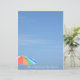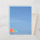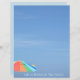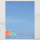Este papel de carta azul ou de rascunho é uma praia com um céu fotográfico, um guarda-chuva colorido brilhante na praia no canto inferior e um texto personalizável "A vida é melhor na praia". Esta imagem é uma fotografia original do litoral por JLW_PHOTOGRAPHY.