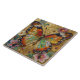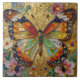 A pretty tile with a front illustration of a beautiful gold, teal and orange butterfly surrounded by yellow, white and purple flowers. It's done with an impasto style and just emanates beauty and grace.