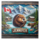 Um castor canadense fica ao lado de um lago de montanha, agarrando um galho, com um pano de fundo de árvores, cabines e a bandeira canadense, mostrando a natureza serena.