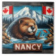 Um castor canadense está brincando segurando um bastão, cercado por montanhas e bandeiras canadenses, capturando a essência da natureza e o orgulho nacional.