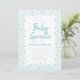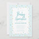 Um convite de chá de fraldas de bebê borrifado com água branca, com bordas de bordas de bordos arco-íris num fundo azul-céu.