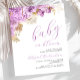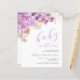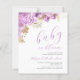 Este doce convite para chás de fraldas apresenta um buquê exuberante de lilás e flores douradas e folhagem. Abaixo, as palavras "baby in bloom" aparecem no elegante guião lilac escrito à mão. Personalize o texto com o nome da futura mãe no script lilac e os detalhes na fonte serif de cinzas de carvão em um fundo branco.