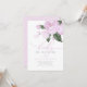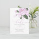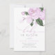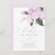 Este convite para chás de fraldas de meninas apresenta "baby in bloom" em tipografia quic combinando fontes de script e serif em laboratório. No topo, há flores de lavanda-d'água roxas com folhas verdes.