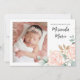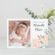 Esta design apresenta um anúncio simples de nascimento de uma criança recém-nascida fotografia, com uma fotografia de recém-nascidos modelo, um mínimo de estatísticas minimalistas de tipografia, um cartão de gravidez de menina, um elegante roteiro de caligrafia rosa floral, rosas rosa botânica verde-água verde-cor, um anúncio de nascimento de uma menina, folhas de flores verdes cor-de-rosa-chic, fotografia de um bebê, um anúncio de uma menina doce